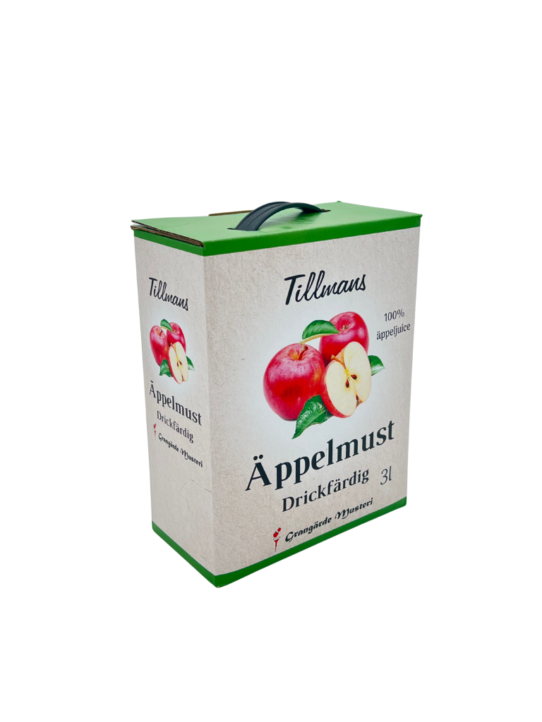 Tillmans Äppelmust tillverkas på svenska äpplen. Pressade svenska äpplen utan några tillsatser. Inget tillsatt socker.